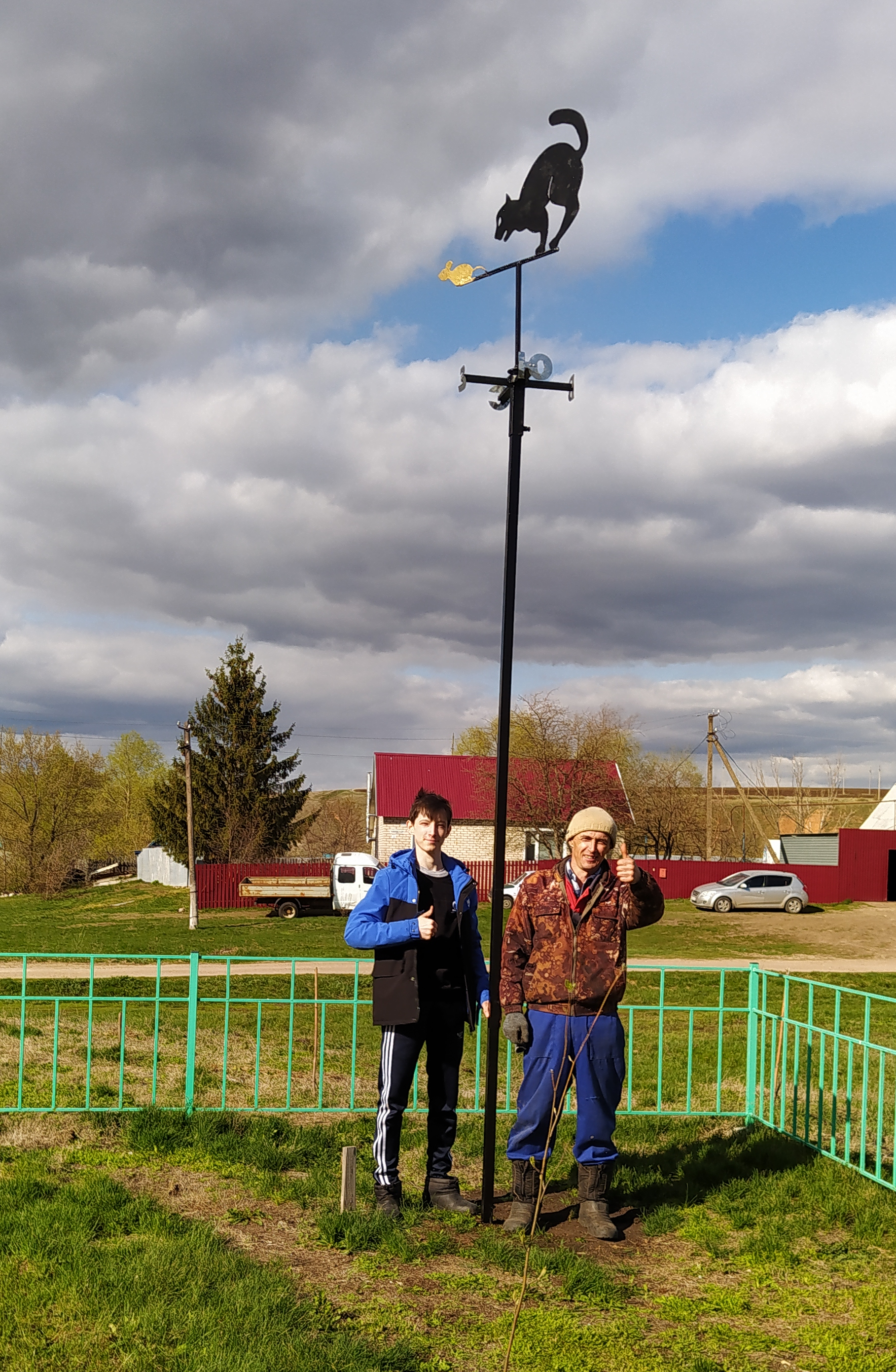 Захаров Максим проводил исследование в рамках конкурса Взлет «Влияние розы ветров на климат местности». Он изучал направления преобладающих ветров на климат нашей местности. Для наблюдения и фиксации направления ветров был необходим флюгер. За помощью он обратился к отцу Александру Алексеевичу, который предложил сыну сконструировать не просто обычный флюгер, а оригинальный арт-объект. Сложную работу, конечно, Максим не мог самостоятельно выполнять. На этапе работы с железом ему помогал папа. Недавно в центре села Администрацией открыта площадка со спортивными снарядами, зоной отдыха для населения. Здесь так же часто собирается молодёжь. Максим встретился с главой администрации Войновым А.В. и высказал свою идею об установке продукта своего проекта на территории площадки. Эта идея понравилась Александру Вениаминовичу, он предложил определённое место для установки объекта. И вот оригинальный объект украшает центр села. Нужно отметить социальную активность родителя Максима А.А. Захарова. Зимой он на своей улице самостоятельно залил для детей настоящую хоккейную площадку, куда стекалась вся сельская детвора. Хочется выразить ему благодарность, его пример вдохновляет на популяризацию семейного волонтерства. Больше бы таких активных родителей!